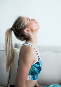 Tilt head toward the ceiling and pucker your lips. Imagine pulling your chin toward the sky.